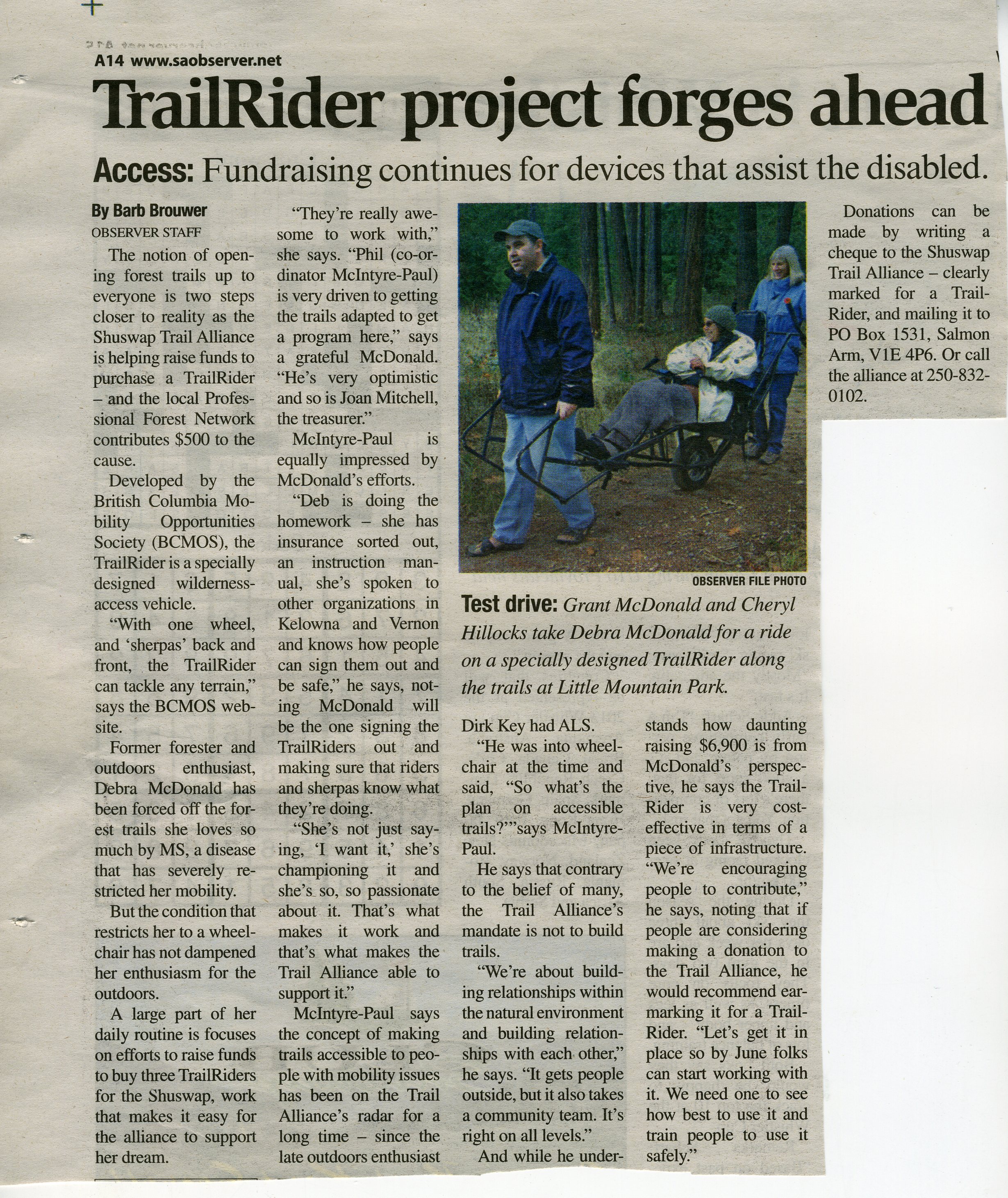 Two steps closer to reality, as the Shuswap Trail Alliance is helping raise funds to purchace a trailrider and the local Professional Forest Network has contributed $500 to the cause.